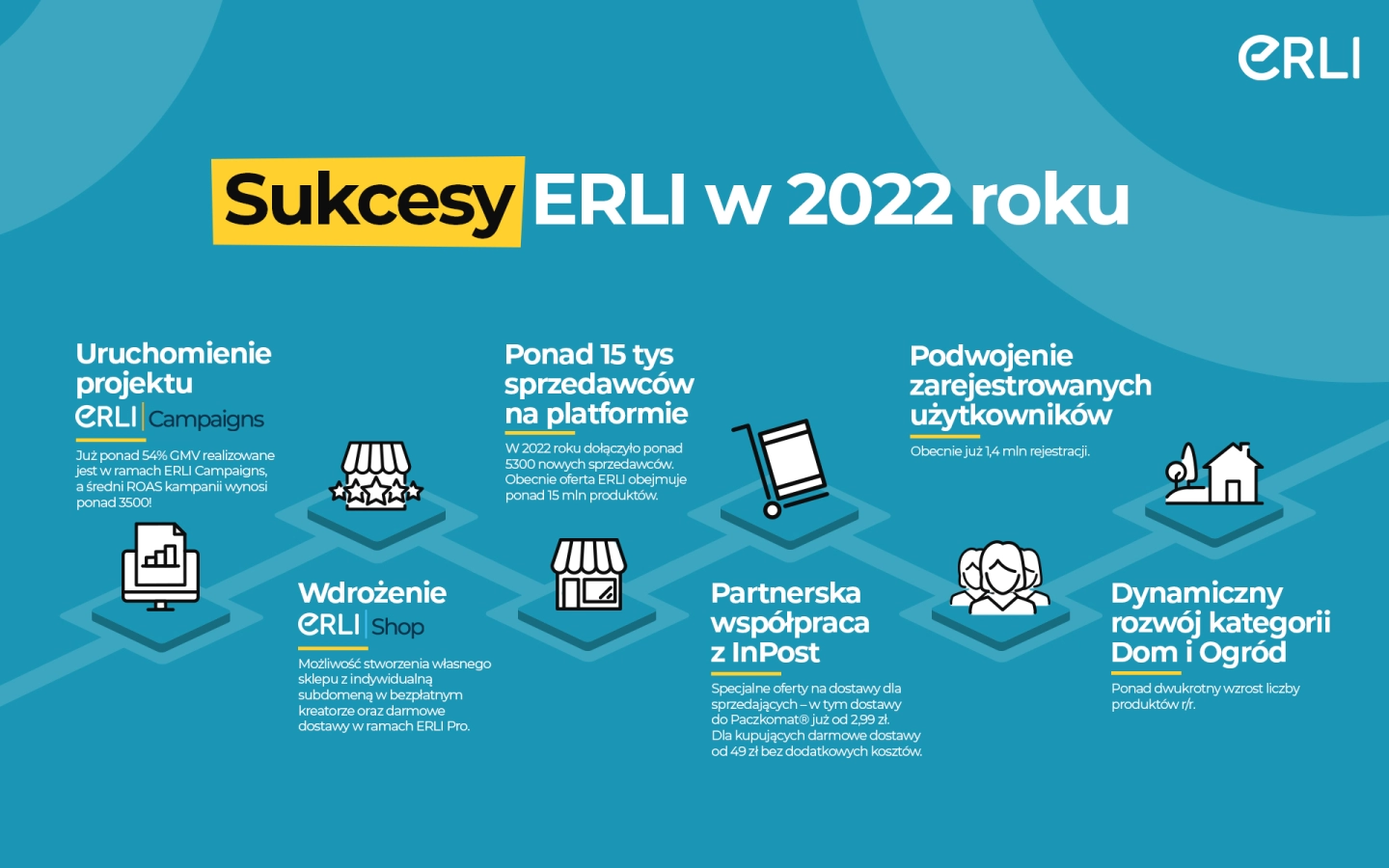 Idealnym przykładem takiego podejścia jest wdrożony przez nas w połowie 2022 roku ERLI Campagins - program oparty o najlepiej funkcjonujące rozwiązania reklamowe na rynku i rozwiązanie dla e-sklepów pozwalające realnie zwiększyć ich sprzedaż. Obecnie już ponad 54% naszego GMV realizowane jest wspólnie z naszymi sprzedawcami w ramach ERLI Campaigns, a średni ROAS (czyli wskaźnik zwrotu z wydatków na reklamę) prowadzonych kampanii wynosi ponad 3500! To najlepiej pokazuje, jak duże znaczenie w aktywacji sprzedaży ma uruchomiony przez nas program wsparcia przedsiębiorców, ale również jak ważne są kompetencje i wiedza zespołu ERLI w tym obszarze. – podkreśla Adam Ciesielczyk, Prezes ERLI - Ponadto, jak na stosunkowo krótko funkcjonujący marketplace możemy się pochwalić imponującym wzrostem liczby zarejestrowanych użytkowników – w ub.r. podwoiliśmy ich liczbę, dzięki czemu odnotowaliśmy prawie 2,5 razy więcej transakcji niż w 2021 roku.